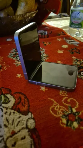 Telefono mobile Samsung Galaxy Z Flip 3, funzionante. Colore viola. Capacità della batteria 3300 mAh, si consiglia di sostituire la batteria. Memoria interna 128GB, RAM 8GB. Presenta alcuni dettagli estetici sul retro e una macchia sullo schermo (la linea segnata sulla piega dello schermo come si vede nelle foto). Non include caricatore o scatola originale.