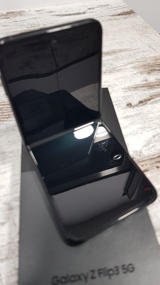 Telefono cellulare Samsung Galaxy Z Flip 3 5G in colore nero. Funziona perfettamente. Cerniera senza problemi. Ben conservato. Deterioramento normale d'uso. Capacità di 256 GB.
