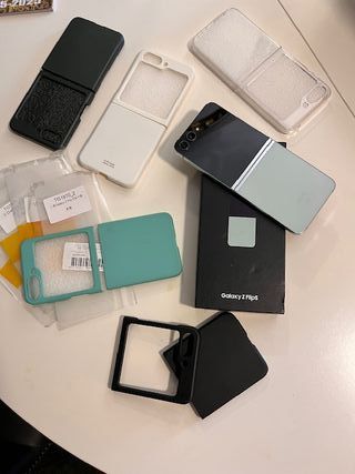 Telefono cellulare Samsung Galaxy Z Flip5 in colore blu e argento. - Ancora in garanzia, circa 3 mesi rimanenti. Con la garanzia hanno appena sostituito lo schermo interno, c'era una macchia. Sostituito da Samsung. Originale. Capacità di archiviazione 256 GB. - In perfette condizioni. Come nuovo. Con protezioni dello schermo. Se sostituiti sarà nuovo. - 4 protezioni dello schermo interno. - 5 custodie per cellulare Flip 5. Blu, trasparente, bianca e due nere. Alcune nuove e altre quasi inutilizzate. - Verrà consegnato completamente resettato. - Nessun difetto. - Include la scatola originale. - Include il caricabatterie. Nessun segno di urti.