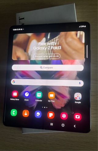 Telefono cellulare Samsung Galaxy Z Fold 3 5G in colore argento. Design pieghevole e schermo espansivo. - Schermo principale Dynamic AMOLED 2X. - Fotocamera posteriore tripla. Funziona tutto bene, le schermate non possono subire colpi 12 GB di RAM e 512 di memoria