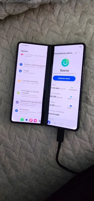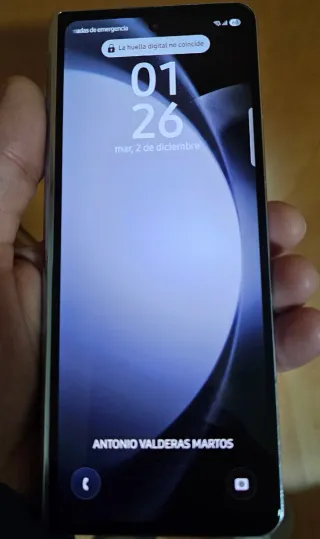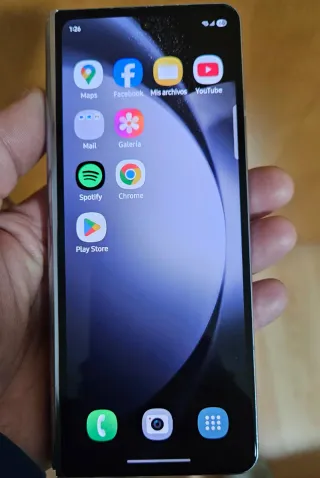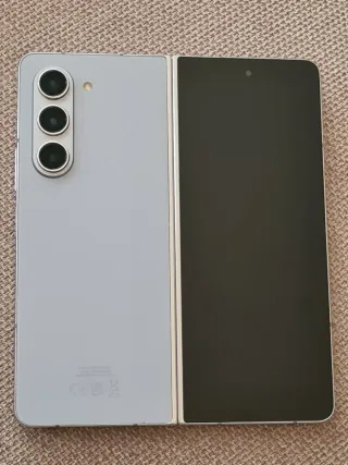 Telefono cellulare Samsung Galaxy Z Fold 5 in colore argento e nero. Include la scatola originale. Acquistato nel negozio ufficiale Samsung Spagna. Garanzia fino ad agosto 2026. Si trova a Las Palmas ma il 18 dicembre mi trasferirò a Madrid. -512GB di spazio di archiviazione - Design pieghevole. - Schermo principale ed esterno. Presenta alcuni segni d'uso, come visibile nelle foto, e alcune macchie sullo schermo esterno, visibili solo con il telefono spento. È stato senza custodia solo per una settimana in attesa della nuova.
