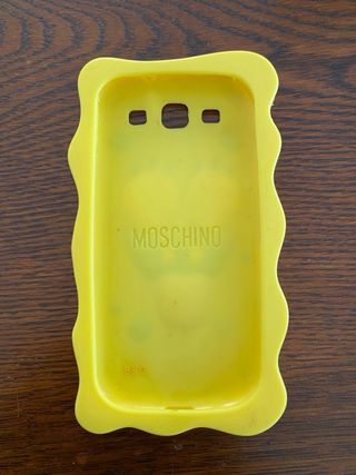 Cover per Samsung S3 con design di Spongebob e logo Moschino. - Materiale in gomma gialla. - Dettagli neri e rossi. - Forma sagomata a Spongebob.