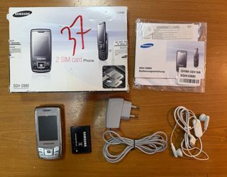Telefono cellulare Samsung SGH-D880 con doppia SIM. Include scatola originale e accessori. - Funzione Dual SIM. - Scatola originale. - Caricabatterie. - Auricolari. - Batteria. - Manuale e garanzia.