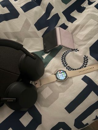 Pacchetto di elettronica con cellulare pieghevole, smartwatch e cuffie. - Cellulare pieghevole Samsung. - Smartwatch con cinturino. - Cuffie Sony nere.