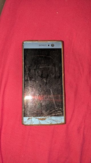 Telefono Sony Xperia XA2 di colore nero. Presenta alcuni segni di utilizzo, come macchie sulla scocca posteriore e lo schermo rotto. - Modello: Xperia XA2 - Marca: Sony