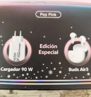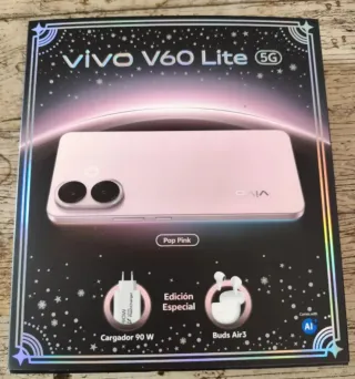 Pacchetto speciale del Vivo V60 Lite in colore rosa, con 8GB di RAM e 256GB di spazio di archiviazione. Il pacco è sigillato, con fattura per la garanzia. Include caricatore Flash Charger da 90W. Viene con auricolari Buds Air3. Edizione Speciale Pop Pink.