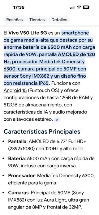 Telefono cellulare Vivo V50 Lite 5G, completamente sigillato. Modello V50 Lite. Connettività 5G. Include IA. Disponibili due unità a 250 euro ciascuna. Prezzo non negoziabile.