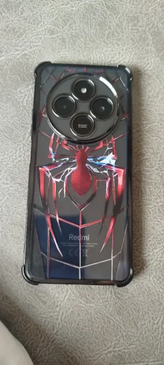 Telefono mobile Xiaomi Redmi 14 C con custodia a tema Spiderman e caricatore. Design di Spiderman sulla custodia. Include caricatore.