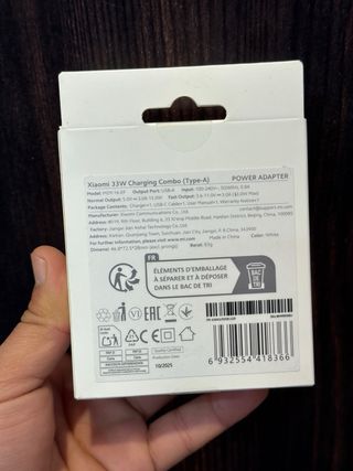Caricatore originale Xiaomi con potenza massima di 33W per una carica rapida ed efficiente. Include porta USB-A e cavo USB-C. Compatibile con la maggior parte degli smartphone e dispositivi elettronici. Ingresso universale 100-240V, ideale per casa o viaggi. Include protezione contro sovraccarico, surriscaldamento e cortocircuiti per una maggiore sicurezza.