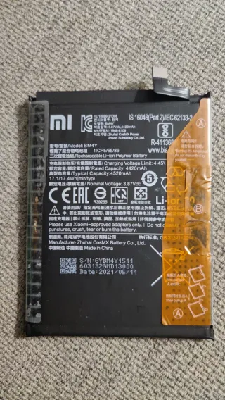 Batteria originale, estratta da un dispositivo smontato. È all'80% della salute. Modello: BM4Y. Capacità: 4420mAh (nominale) / 4520mAh (tipica). Voltaggio: 3.87Vdc. Tipo: Batteria Li-ion polimerica. Produttore: Zhuhai CosMX Battery Co., Ltd. Data di produzione: 11/05/2021.