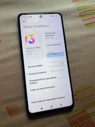 Telefono mobile Xiaomi Mi 10T Lite con 64 GB di spazio di archiviazione. Presenta un graffio sul retro ma non influisce sul funzionamento o sulla fotocamera. - Versione MIUI Global 13.0.12 Stabile. - Versione Android 12. - Aggiornamento di sicurezza Android del 2022-11-01.