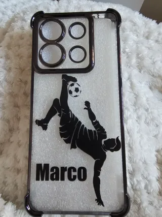 Custodia protettiva per Xiaomi Redmi Note 13 Pro 5G con design da calciatore e il nome Marco. Design da calciatore in silhouette nera. Nome Marco in lettere nere. Protezione Marco in colore scuro. Trasparente con rilievo.