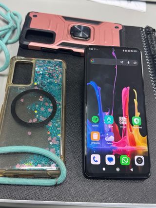 Telefono cellulare Xiaomi Redmi Note 11 Pro 5G in colore nero - 8GB RAM, 128GB di spazio di archiviazione - sblocco tramite impronta digitale - fotocamera da 108MP - protezione schermo nuova - il telefono funziona perfettamente - l'unico inconveniente lieve è il pulsante di blocco che a volte non funziona correttamente. Tuttavia, non impedisce l'uso e lo sblocco. Include una scheda di accessibilità che facilita questo e la riparazione costerebbe 5€. In dotazione: caricabatterie USB e cavo USB C - Custodia trasparente con glitter turchese e cordoncino - Custodia rigida color rosa.