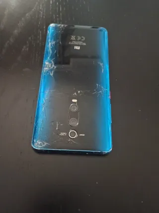 Telefono mobile Xiaomi Mi 9T in colore blu. Presenta danni visibili sul retro. Ha lo schermo rotto e non so se ha un codice o un account Google precedente. Modello: M1903F10G. Fabbricato in Cina.
