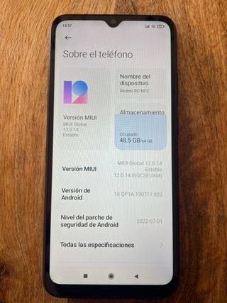 Telefono mobile Xiaomi Redmi Note 9 con 128 GB di spazio di archiviazione. - Versione MIUI: Global 13.0.3 Stabile. - Versione Android: 12. - Aggiornamento sicurezza Android: 01/11/2022.