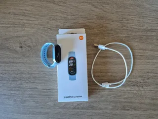 Braccialetto Xiaomi Smart Band 9 per attività, con un anno di utilizzo. Include cavo di ricarica e tre braccialetti compatibili (2 neri e 1 blu) nuovi, non usati. Colore beige.
