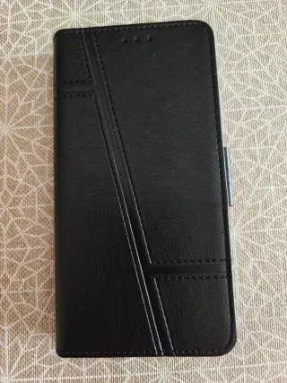 Custodia a libro per cellulare in colore nero. Presenta un design moderno con linee incise e cuciture decorative. Materiale: polipelle. Chiusura: magnetica. Design: tipo libro con linguetta elegante e discreta. Colore: nero.