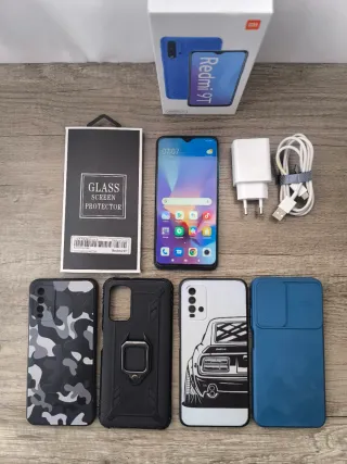 Telefono mobile Xiaomi 9T. Include la sua scatola con manuali, cavo di ricarica e custodia protettiva rigida.