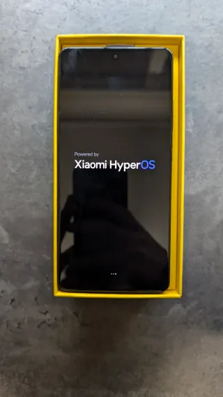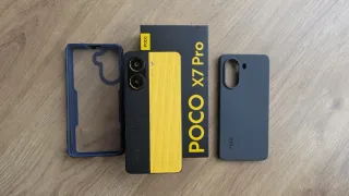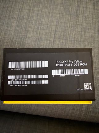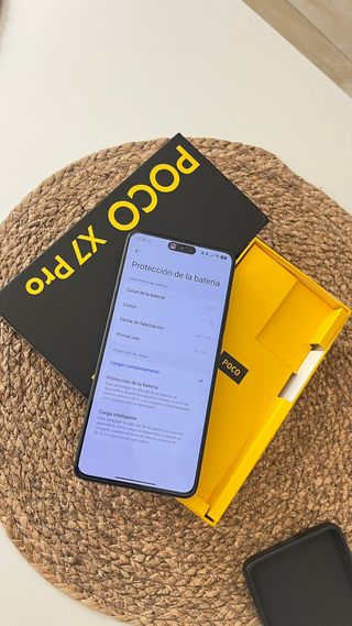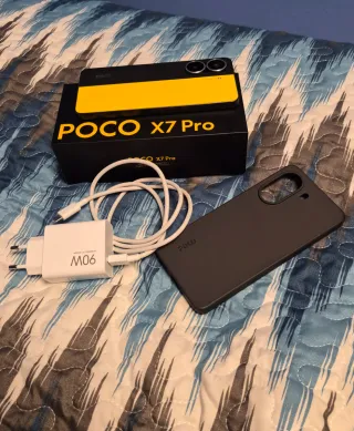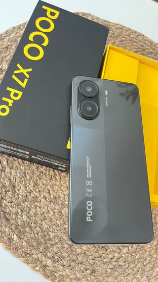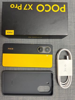 Telefono mobile Xiaomi Poco X7 Pro con la sua scatola originale e accessori. Design bicolore in nero e giallo. Include cavo di ricarica. Custodia protettiva di colore grigio.
