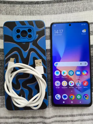 Telefono mobile Xiaomi Poco X3 NFC con custodia protettiva e cavo di ricarica. - Archiviazione 64 GB - Memoria RAM 6 GB - Versione MIUI 14.0.5 - Colore blu e nero. - Include custodia. - Include cavo USB.