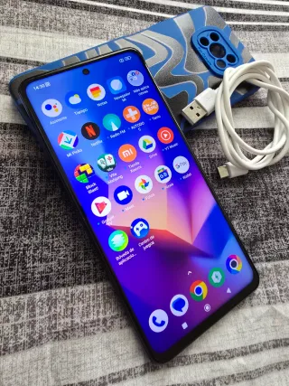 Telefono mobile Xiaomi Redmi Note 14 Pro Plus 5G in tonalità blu e verde. Un dispositivo con grande schermo e design moderno. 12 GB di RAM e 512 GB di memoria interna. Poco utilizzato e ben curato. Viene fornito con custodia e caricabatterie rapido acquistato separatamente poiché non viene fornito con il telefono. - Schermo da 6,67 pollici. - Fotocamera principale da 200 MP. - Batteria da 5000 mAh. - Ricarica rapida da 120 W.