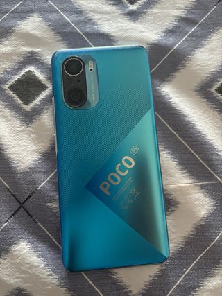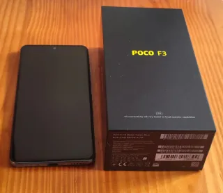 Telefono mobile Xiaomi Poco F3 con finitura blu. 6GB di RAM e 128GB di spazio di archiviazione. Schermo Amoled 120Hz. Snapdragon 870. Include scatola e accessori originali, cavo USB-C e caricabatterie originale. Include 2 custodie regalo e protezione per lo schermo installata.
