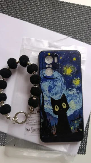 Custodia per telefono Xiaomi Poco F3 con un design ispirato alla Notte Stellata di Van Gogh, con un gatto nero. Caratteristiche: Design artistico. Include un accessorio da polso con pompon neri e perline d'argento.