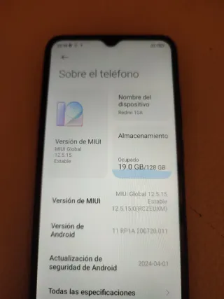 Telefono mobile Xiaomi Redmi 10A. - Modello: Redmi 10A - Versione MIUI Global: 12.5.15 Stabile - Archiviazione: 19.1 GB / 128 GB - Versione Android: 11 RP1A.200720.011 - Aggiornamento sicurezza Android: 01/04/2024