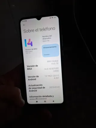 Telefono mobile Xiaomi Redmi 10C con grande capacità di archiviazione. L'altoparlante non funziona ma il resto funziona perfettamente. - Versione MIUI: 14.0.16 Global. - Versione Android: 13 TKQ1.22111. - Aggiornamento sicurezza Android: 2025-07-01. - Archiviazione: 38,5 GB occupati su 128 GB.