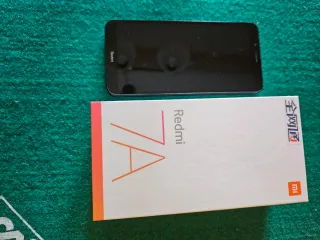 Telefono mobile Xiaomi Redmi 7A. - Schermo con crepe visibili. - Scatola del prodotto inclusa.