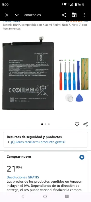 Batteria di ricambio per Xiaomi Redmi Note 7. Modello BN4A. Capacità 3900mAh (min/tip). Voltaggio 3.85VDC.
