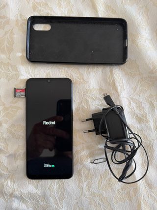 Telefono mobile Xiaomi Redmi 9A in colore nero. Include caricatore e custodia protettiva. In regalo scheda di memoria SD da 64GB.