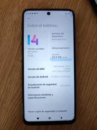 Telefono mobile Xiaomi Redmi Note 9 Pro con 128 GB di spazio di archiviazione. - Versione MIUI: Global 14.0.5 Stabile. - Versione Android: 12 SKQ1.211019.001. - Aggiornamento sicurezza Android: 2023-06-01.