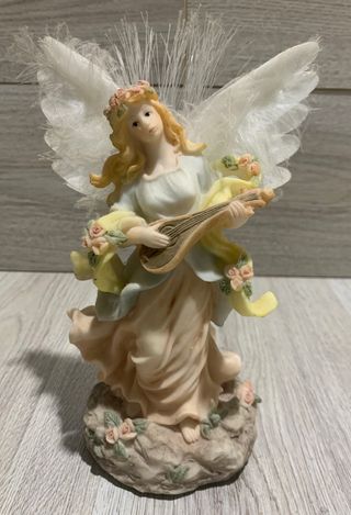 Deliziosa statuetta di un angelo con ali bianche e dettagli floreali. con sistema di illuminazione interna a batterie. L'angelo tiene in mano uno strumento musicale. altezza circa 20 cm - Decorazioni floreali rosa. - Ali in materiale leggero e trasparente. - Base rocciosa con fiori.