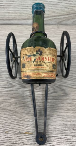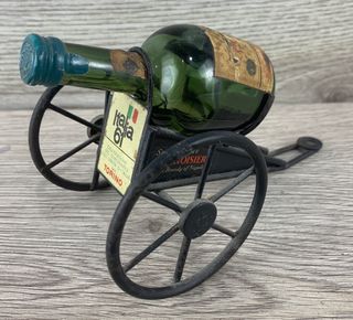 Rara bottiglia vintage Courvoisier del 1961, celebrativa dell'Unità d'Italia. - Bottiglia in vetro verde. - Etichetta Italia 61 con Torino. - Supporto in metallo nero a forma di carretto. - Tappo in verde. - dimensioni 10X7X6 cm circa