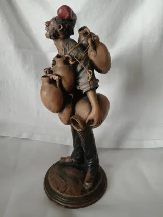 Statuetta raffigurante un uomo con anfore sulla schiena e un'altra in mano. - Cappello rosso. - Abiti dettagliati. - Base rotonda.