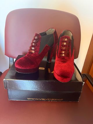 Eleganti scarpe con tacco alto, realizzate in velluto. - Dettagli in velluto rosso. - Inserti elastici neri. - Decorazioni a listelli. - Suola platform. - Tacco 12 cm con plateau