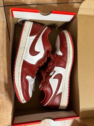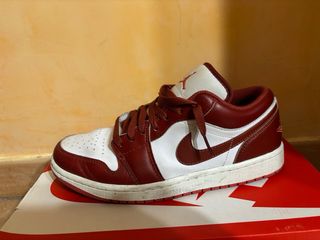 Scarpe Air Jordan 1 in ottime condizioni, colore rosso e bianco. - Design iconico. - Tomaia in pelle. - Suola in gomma.