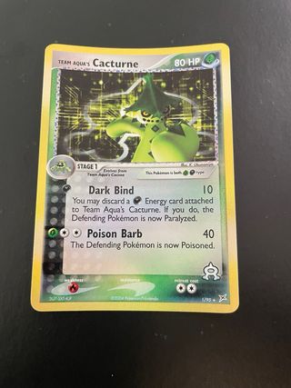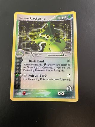 Carta Pokémon Team Aqua's Cacturne dall'espansione EX Team Magma vs Team Aqua. - Numero carta: 1/95 - Rarità: Holo - Tipo: Erba - HP: 80 - Attacco 1: Dark Bind (10 danni) - Attacco 2: Poison Barb (40 danni)