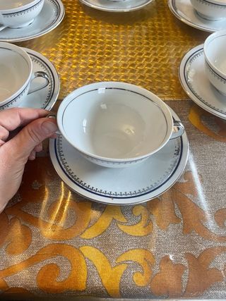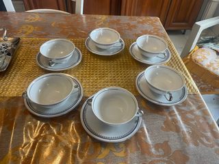 Elegante set di sei tazze da caffè in porcellana Bavaria. - Design raffinato con dettagli argentati. - Perfette per ogni occasione speciale. - Materiale di alta qualità. Fantasia con striscia blu marino e argento manici in argento Conservato in perfetto stato