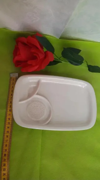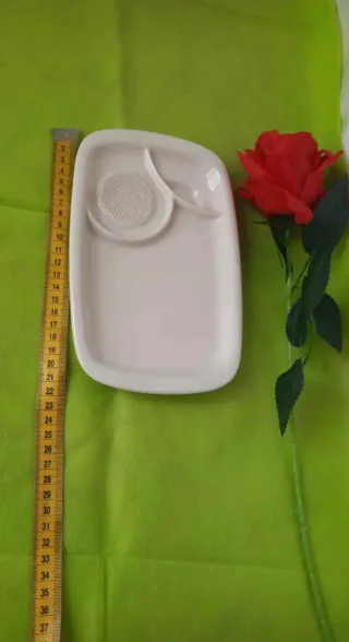 Elegante piatto da portata, perfetto per antipasti o stuzzichini. Il suo design moderno lo rende un'aggiunta raffinata alla tavola. - Forma rettangolare con angoli arrotondati. - Scomparto integrato per salse o condimenti. - Superficie decorata con un motivo a rilievo che serve per grattugiare le spezie.