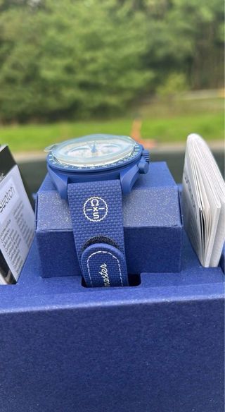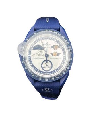 Orologio Omega x Swatch MoonSwatch. - Cassa e cinturino blu. - Quadrante bianco con dettagli. - Chiusura a strappo.