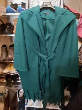 Mantella o cappa dal colore verde intenso, perfetta per aggiungere un tocco di stile al tuo guardaroba. La sua versatilità la rende adatta a diverse occasioni. - Cintura in vita per una vestibilità personalizzata. - Orlo con frange decorative.