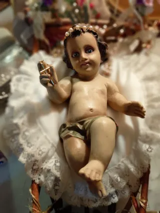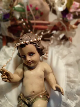 Statua di Gesù Bambino in culla decorata. - Bambino con rosario. - Culla in legno con decorazioni floreali e nastri. - Base in pizzo. Decorato e colorato a mano Gesù in Resina Culla in legno difetti in foto Culla cm 32 Gesù cm 25 dalla corona rosario di piccole perle e ferro No prenotazioni No trattative Spedizione attente ed accurate