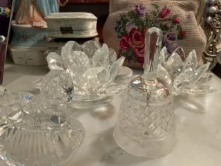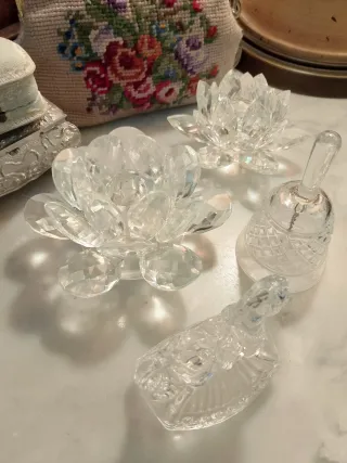 Delicati fiori in cristallo vintage Tahari taglio cristallo vetro Lotus trasparente Bellissimi e perfetti Anni 80 Un fiore è un portacandele - Design a forma di fiore di loto. - Un piccolo campanello in cristallo,nuovo - Una figura di animale in cristallo,nuovo Vendita solo in lotto Prezzo non trattabile. Spedizione accurate