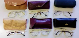 Set di occhiali vintage con custodie. - Custodia marrone in pelle. - Custodia bordeaux in pelle. - Custodia nera in pelle. - Occhiali con montatura dorata e lenti trasparenti. - Occhiali da aviatore con montatura dorata e lenti sfumate. - Occhiali con montatura dorata e lenti trasparenti. In buone condizioni anche se essendo usati possono riportare i segni del tempo