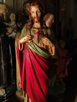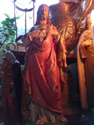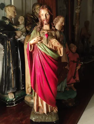 Antica statua raffigurante Gesù con il Sacro Cuore. Dettagli dipinti a mano. Materiale: gesso Difetti in foto Cm 31x11 Spedizione attente ed accurate Sconto solo su set