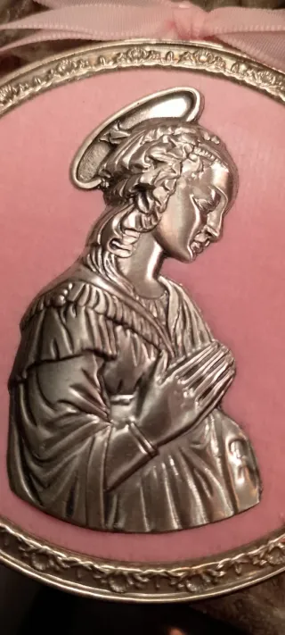 Medaglia votiva in argento 800, raffigurante la Vergine, risalente agli anni '60. Il fondo è in velluto rosa. Dettagli in rilievo. Cornice decorata in argento Retro in resina Nel suo astuccio originale che indica la qualità In perfetto stato Misure in foto