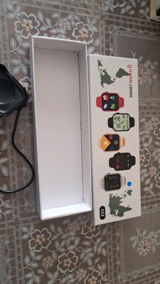 Smartwatch modello 8 con cinturino blu. - Cinturino in silicone blu. - Caricabatterie incluso. Per usarlo dovete scaricare un'app che si chiama: Fitpro