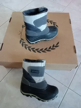 Doposci Tecnica per bambini, taglia 25-26. - Colore grigio e nero. - Chiusura con velcro. - Interno foderato in tessuto caldo. Doposci Tecnica Tender II Junior in ottimo stato anche se usati. Rivestiti internamente in lana sintetica, suola in gomma. Chiusura a strappo, sul doposci destro c'è un piccolo punto di contatto: il velcro ha tirato un pochino il tessuto (difetto solo estetico). Qualche pallino sul bordo del rivestimento interno Senza scatola.